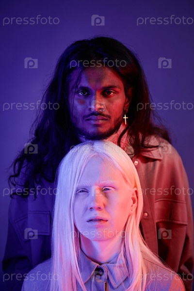 Вертикальный студийный снимок красивого длинношерстного индийского мужчины с бородой на лице андрогинная молодая женщина с альбинизмом смотрит в камеру, синего фона
