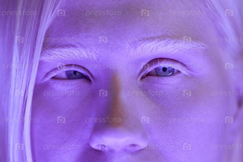 Макро-близкий студийный снимок молодой женщины с альбинизмом, стоящей в ультрафиолетовом неонном свете и смотрящей на камеру