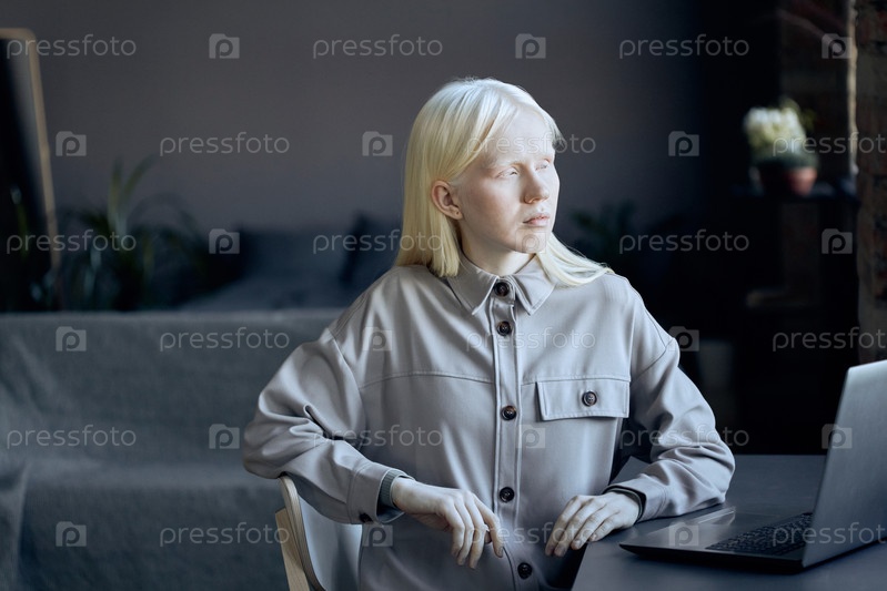 Средний портрет красивой молодой женщины с альбинизмом, сидящей за столом перед ноутбуком в верхней гостиной дома и оглядывающейся на что-то другое