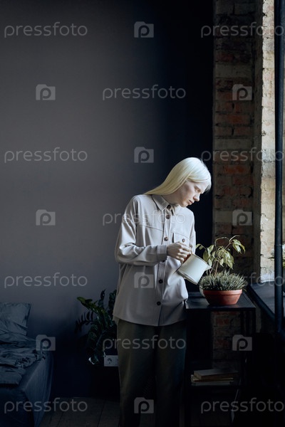 Вертикальный снимок современной молодой женщины с альбинизмом, носящей модный случайный серый наряд для полива комнатных растений в ванной комнате