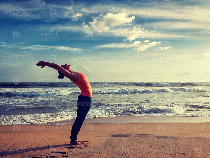 Винтажное ретро-эффектное изображение в стиле хипстера молодой спортсменки, занимающейся йогой Солнечный салют Сурья Намаскар позирует Хаст Уттанасана на тропическом пляже при закате