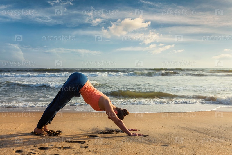 Женщина занимается Surya Namaskar Udoors йогой на тропическом пляже