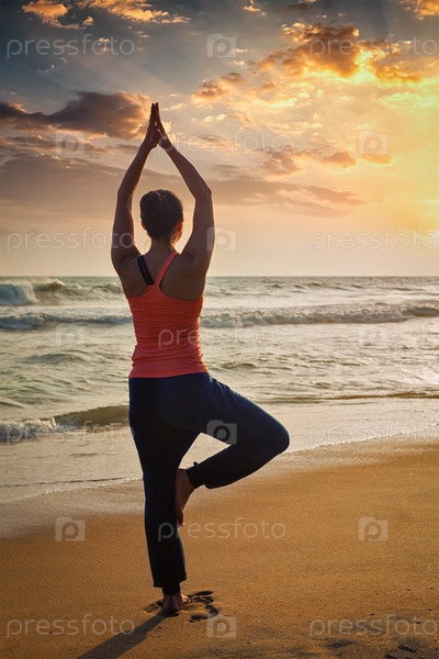 Молодая спортивная женщина занимается асанами дерева йоги на пляже