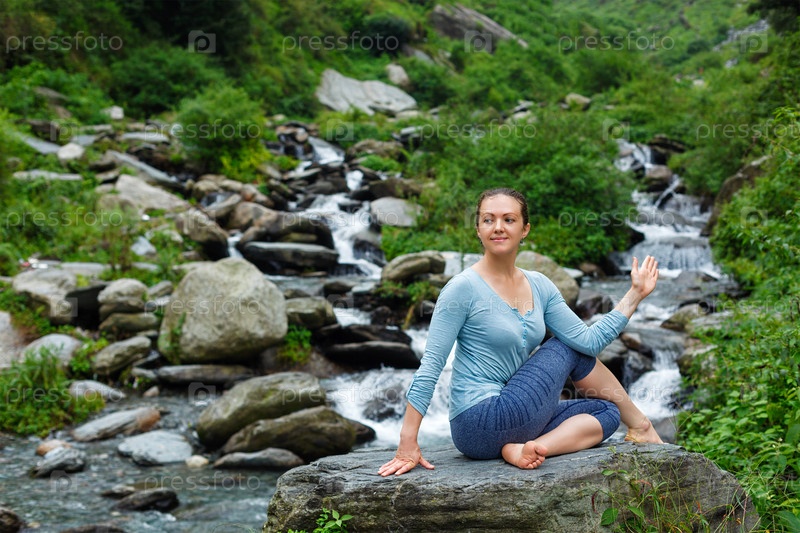 Обучения йоге на открытом воздухе - женщина, выполняющая асану Ардха мацеендрасана - полупозвоночный поворот позирует у тропического водопада в Гималаях Индии