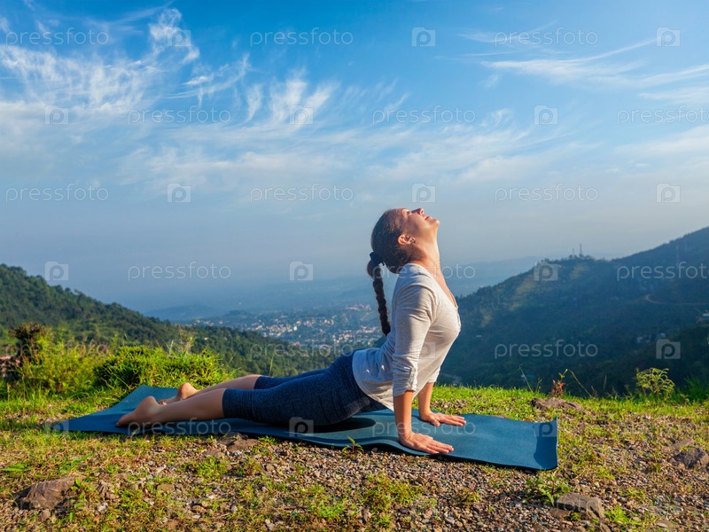 Йога на открытом воздухе - женщина практикует Аштангу Винясу йогу Сурья Намаскар Солнце Приветствие асана Урдхва Муха Сванасан - собака позирует в горах утром