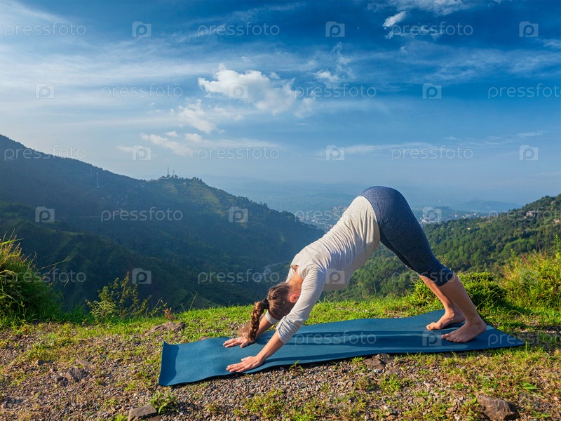 Молодая спортсменка занимается йогой в горах