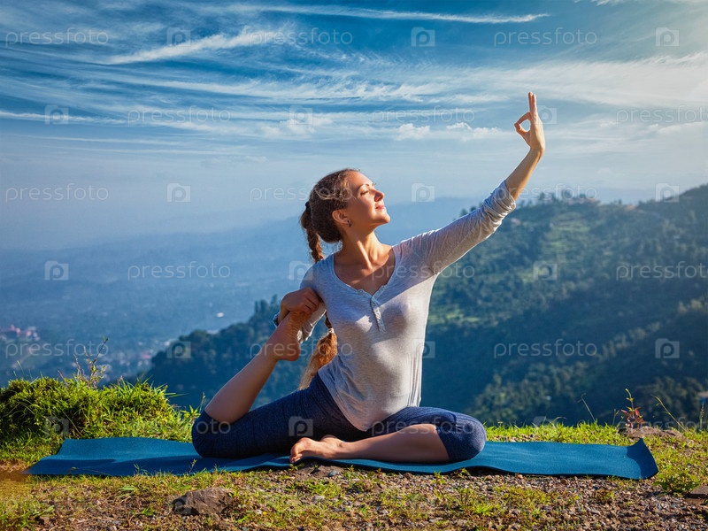 Красивая женщина занимается асанами йоги на открытом воздухе в горах