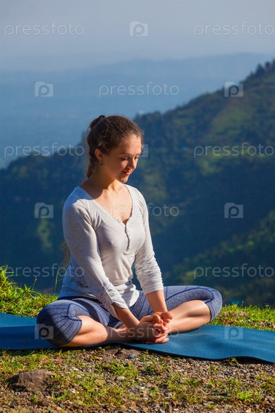 Спортивная женщина практикует Бадда Конасана йога асан на открытом воздухе