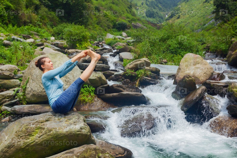Ашиата Виси балансирует перспективы Убай Лаунны Великой двойной йоги и тропического водопада в Гималаях в Индии