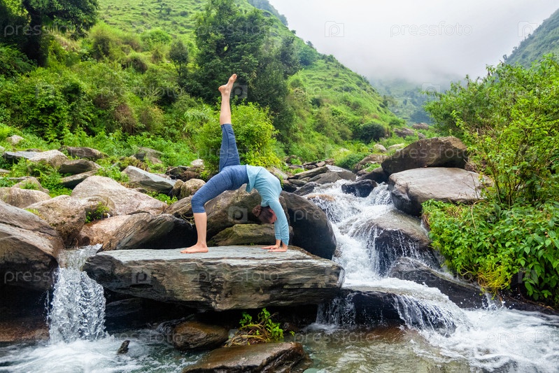 Женщина, занимающаяся йогой и водопад