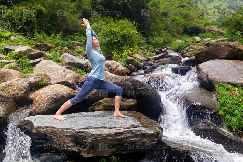 Йога на открытом воздухе - атлетическая женщина делает Аштангу Виньясу йогу асану Вирабхадрасана 1 Воин позирует у водопада в Гималаях