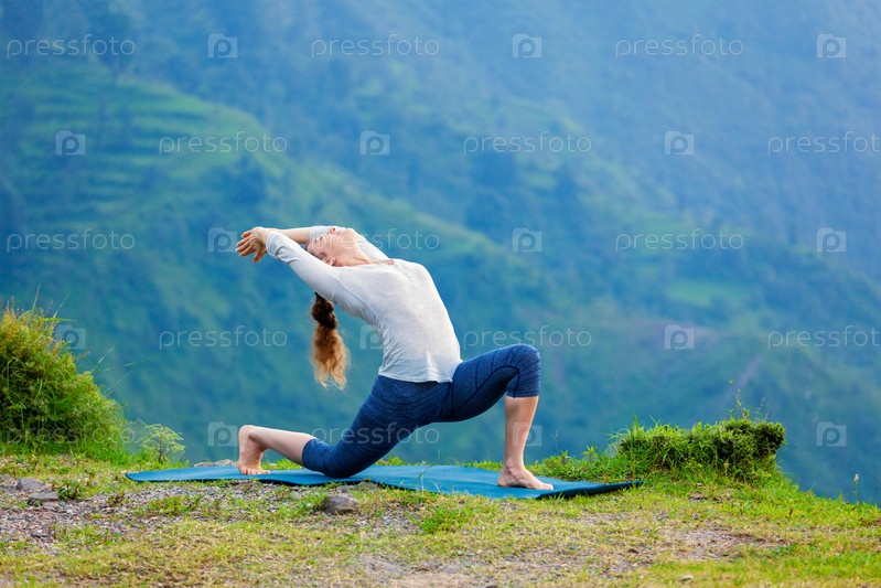 Спортивная женщина практикует йогу асана anjaneasana в горах