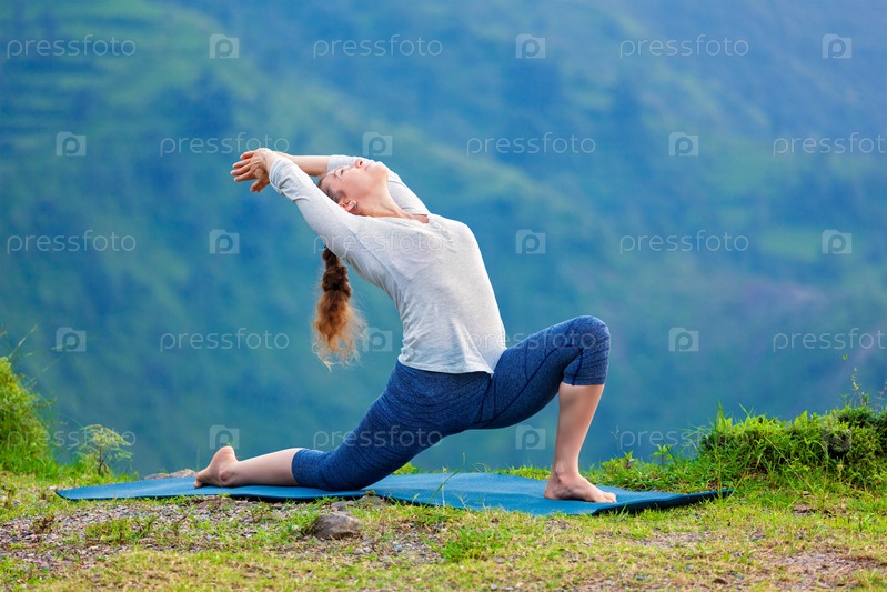 Йога на открытом воздухе - Женская спортивная практика Хатха-йога Асана Анджанейасан - Низкий легочный полумесяц Позируйте на свежем воздухе в Гималаях