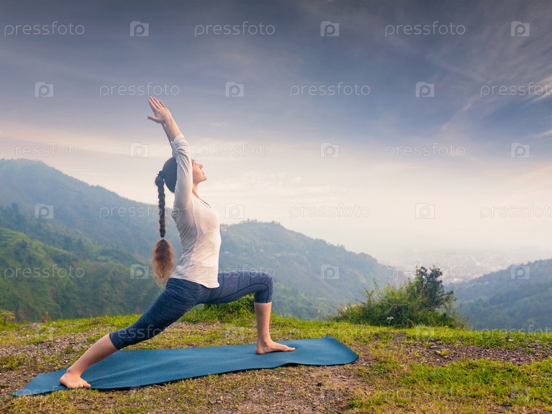 Женщина, выполняющая асану йоги Virabhadrasana 1 - Воин позирует для рекламных щитов