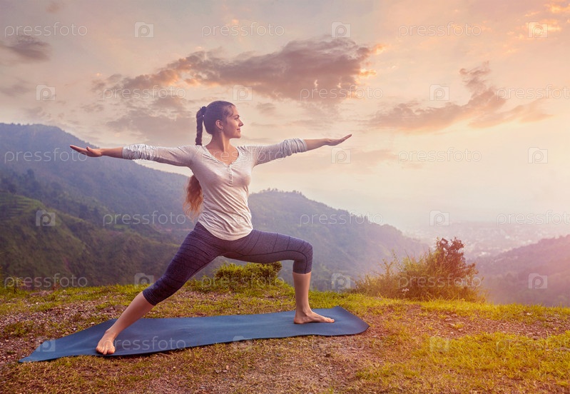 Внешняя йога - Спортсменка делает Аштангу Виньяса Йоги асана Вирабхадрасан 2 Воинская Позиция в горах
