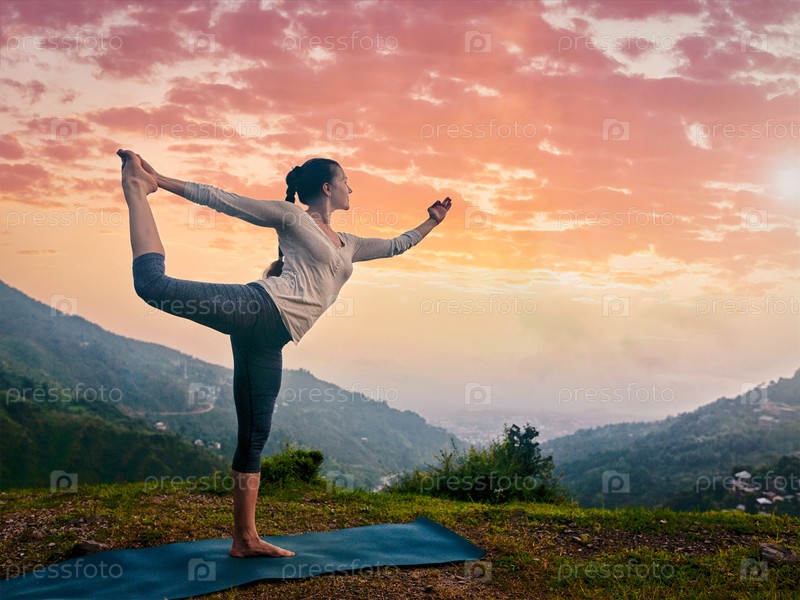 Женщина, практикующая натараджасана йогу под открытым небом и водопадом