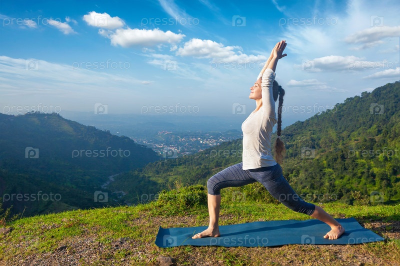 Женщина, выполняющая асану йоги Virabhadrasana 1 - Воин позирует для рекламных щитов