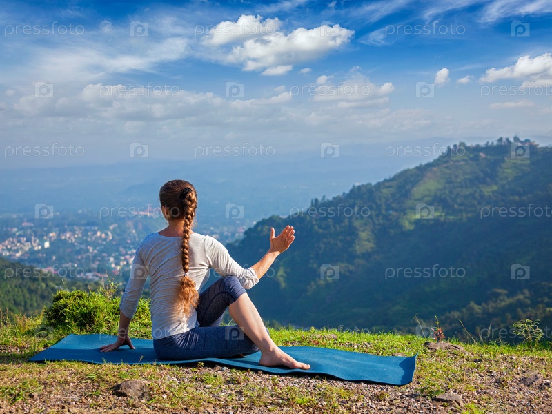 Женщина практикует йогу Асана на открытом воздухе