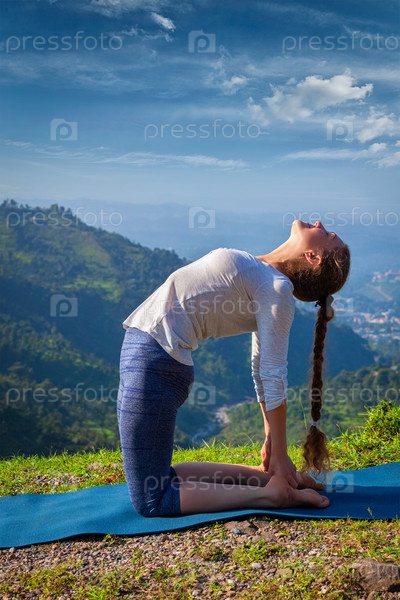 Женщина, занимающаяся юстраной верблюжьей пушечной йогой на открытом воздухе