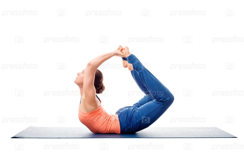 Спортсменка практикует йогу как асану Дханурасана Атлетика