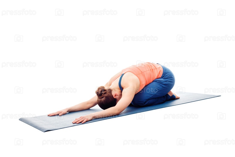 Женщина выполняет Аштанга Виньяса Йоги, расслабляющую асану Баласана - детская поза - позу отдыха или контрасан для многих асан, изолированных на белом фоне