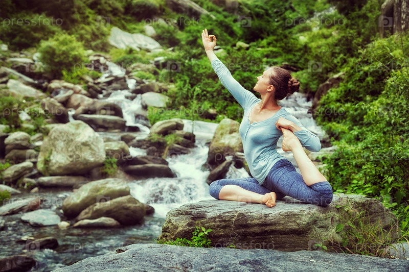 Винтажный ретро-эффект в стиле хипстерского изображения спортсменки, выполняющей асану йоги Eka pada rajakapotasana - одноногий король голубей позирует у тропического водопада