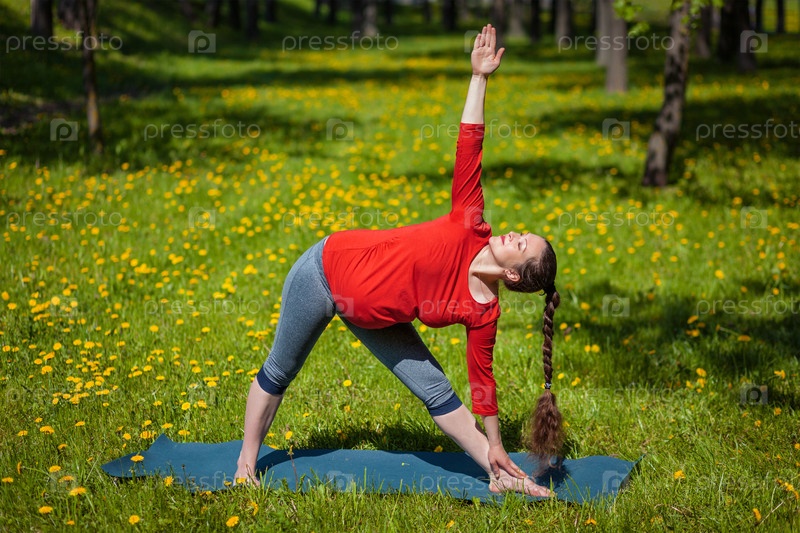 Беременные упражнения по йоге - Трикон беременной матки Доан Уттаты обгоняет траву летом