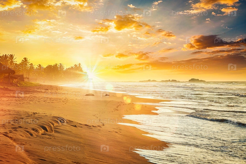 Пляжный курорт на фоне отдыха - тропический закат на пляже океана. Шри-Ланка. С утечками света и вспышками линз