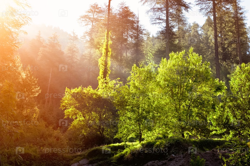 Утренний лес с пышными листьями солнечного света - концепция свежести