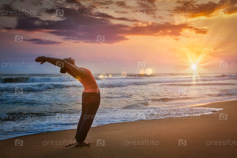 Молодая спортсменка занимается йогой Greeting Surya Namaskar