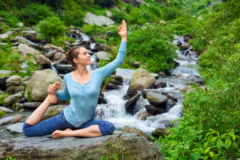 Красивая женщина занимается асанами йоги на открытом воздухе у тропического водопада