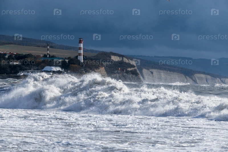 Геленджикский маяк стоит на высоком скалистом берегу. Сильный шторм в Черном море. Большие волны качаются по высокому берегу. Солнце светит сквозь облака