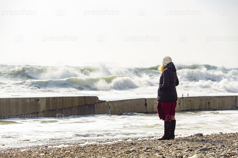 Девочка смотрит на море среди штормовых волн.Девушка в куртке и вязанной шляпе.Ветер дует