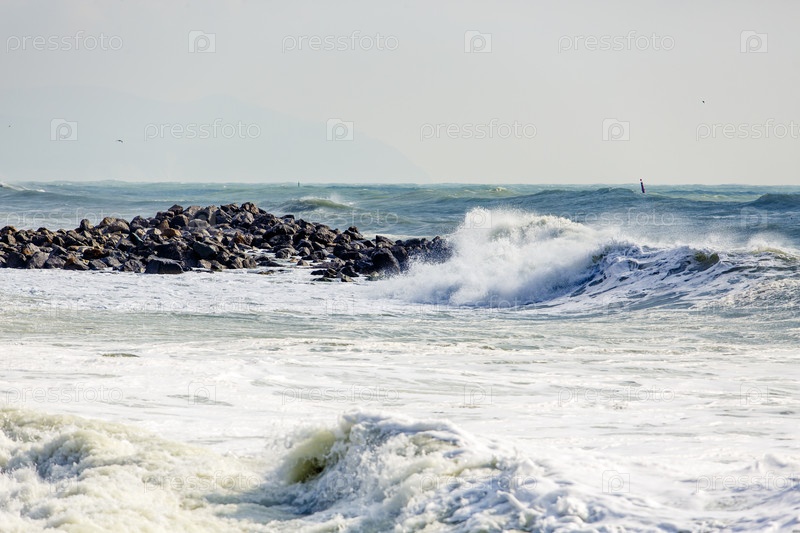 Зелёные штормовые волны, все в виде пены и спрея, ударили по прибрежным скалам