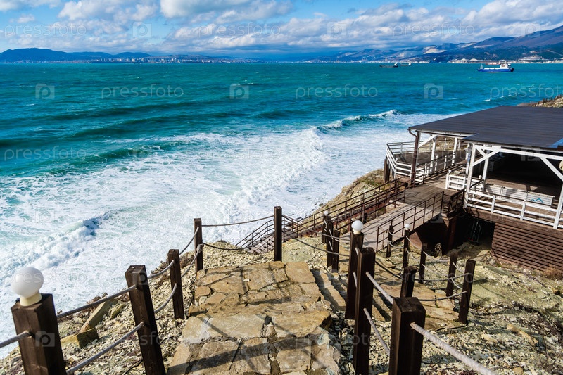 Кабардинский курорт.Каменные ступеньки ведут к завесе Черного моря.На горизонте порт Новороссийск и горы Кваказ