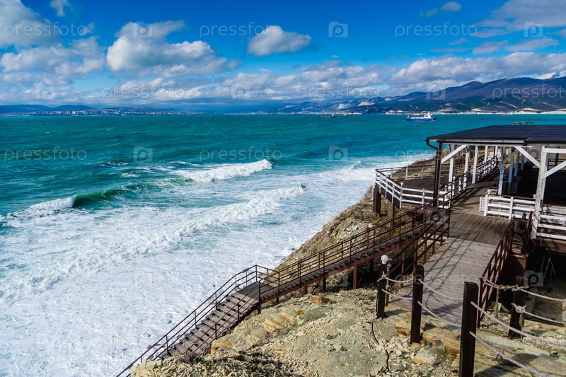 Курорт Кабардинка. Лестницы ведут к пляжу. Черное море спокойно, а вода голубая. Порт Новороссийск на заднем плане