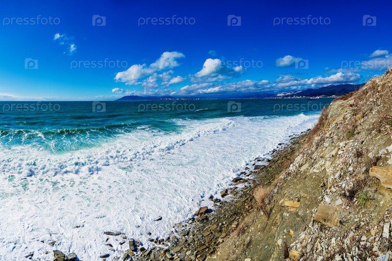 Курорт Кабардинка. Штормовые волны. Пейбл-Бич. На горизонте город Новлорусский и Кавказские горы