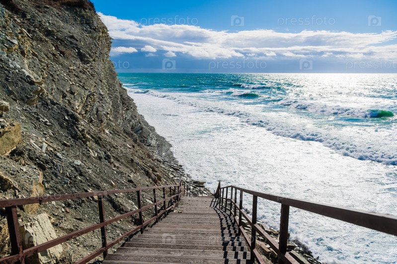 Кабардинский курорт. лестницы ведут к пляжу. Черное море спокойно, а вода голубая