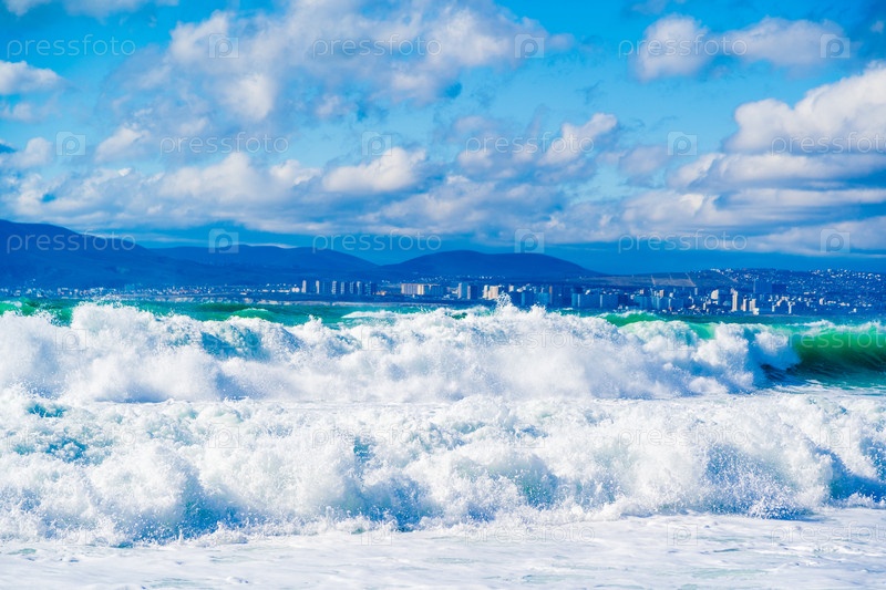 Большие зеленые штормовые волны в белой пены прокатываются по скалистому пляжу Кабардинки.На заднем плане - порт Новороссийск и Кавказские горы