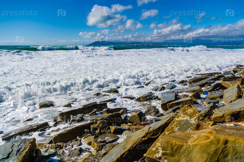 Кабардинский курорт. большие зеленые штормовые волны в белой пены прокатываются по скалистому пляжу Кабардинки. на заднем плане порт Новороссийск и Кавказские горы. крупные камни на берегу