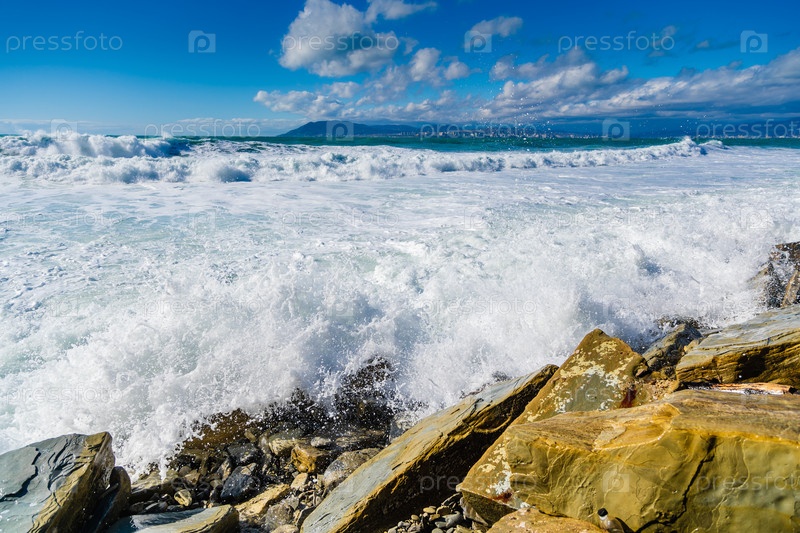 Кабардинский курорт. большие зеленые штормовые волны в белой пены прокатываются по скалистому пляжу Кабардинки. на заднем плане порт Новороссийск и Кавказские горы. огромные камни на берегу. вспышки и пена от волн