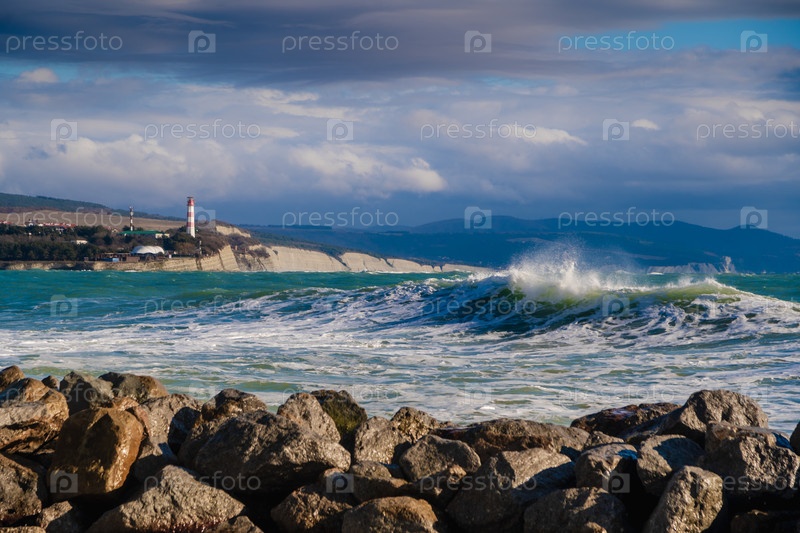Большие зеленые штормовые волны качаются на фоне геленджикского маяка. маяк стоит на высокой скале. в переднем плане большие камни