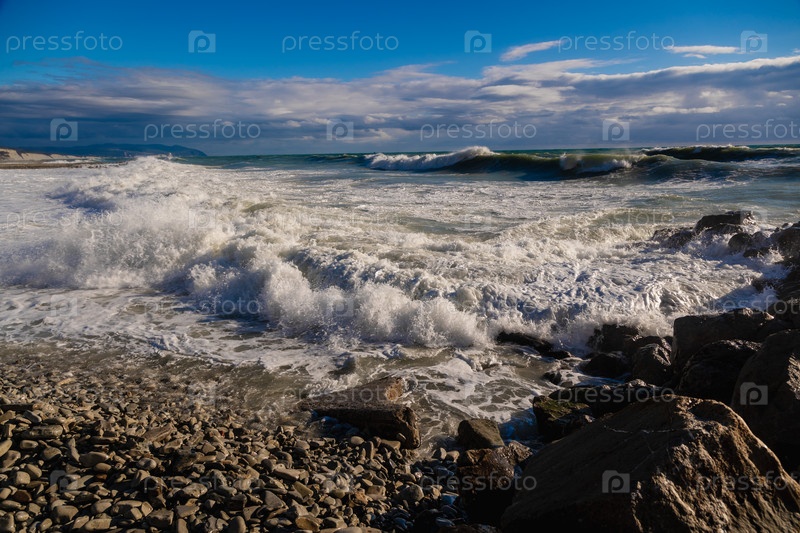 Большие зеленые штормовые волны в белой пены прокатываются по скалистому пляжу Геленджик. Огромные камни на берегу. Вспышки и пена от волн