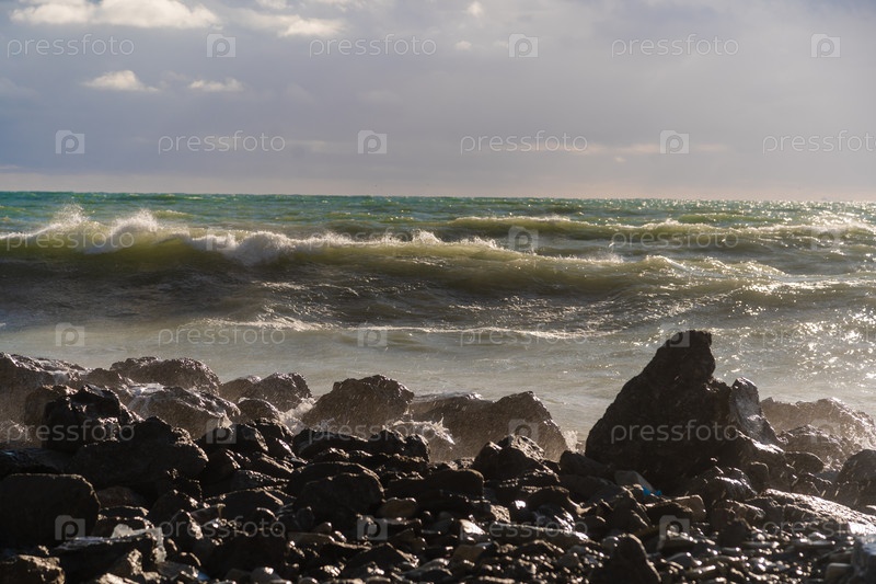 Большие зеленые штормовые волны в белой пены прокатываются по скалистому пляжу Геленджик. Огромные камни на берегу. Вспышки и пена от волн
