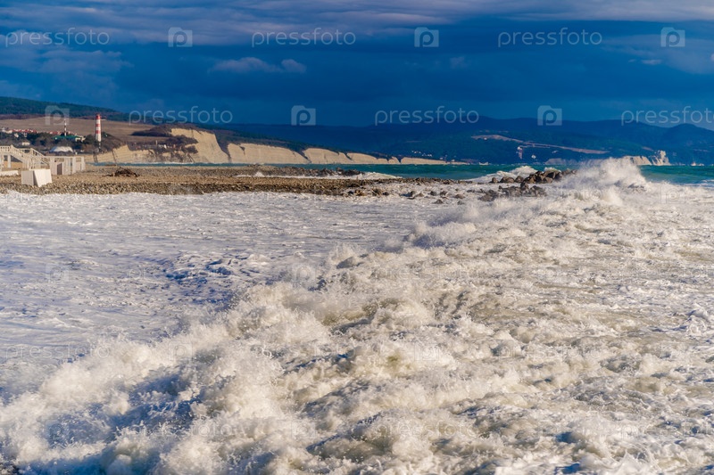 Большие зеленые штормовые волны прокатываются на фоне геленджикского маяка.Маяк стоит на высокой скале