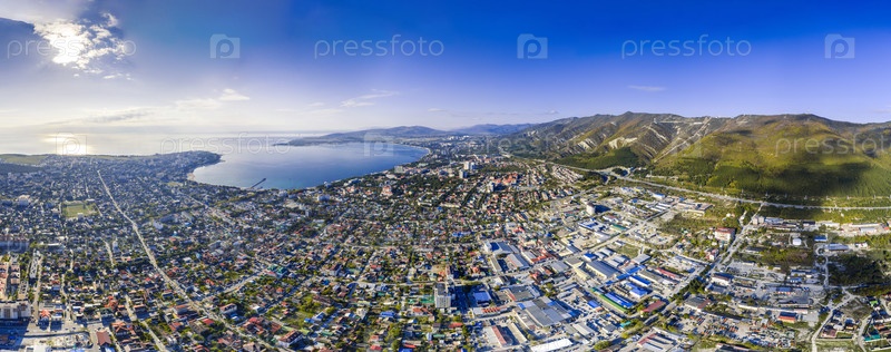 Панорама курорта Геленджик с высоты птичьего полета.На переднем плане - городские кварталы, затем залив Геленджик, справа - Кавказские горы