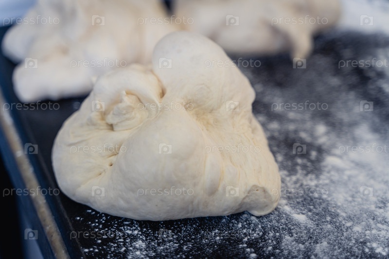 На стойке сидит кусок теста с большим количеством муки