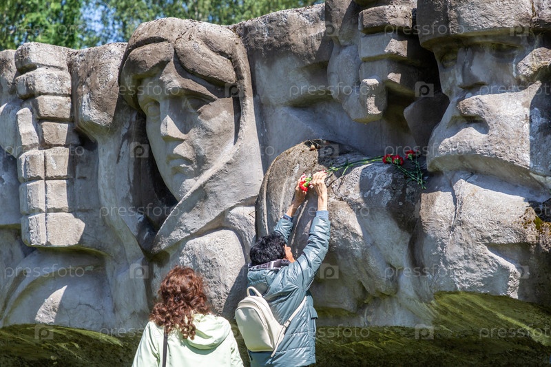 Женщина возлагает цветы на барельеф мемориального комплекса Лемболовская крепость в Ленинградской области
