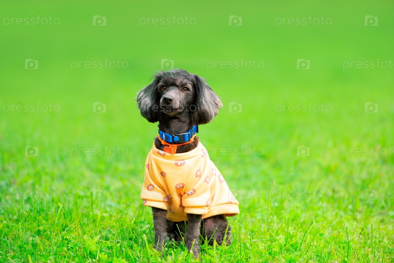 Маленькая пожилая собака в оранжево-жёлтом капюшоне и воротнике с костной меткой стоит на траве и отворачивается. Старый питомец в животных одеждах и розовый воротник, место для текста