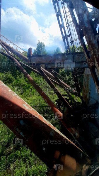 Ржавый каркас автомобилей стоит в пышной растительности под голубым небом в спокойной природной обстановке